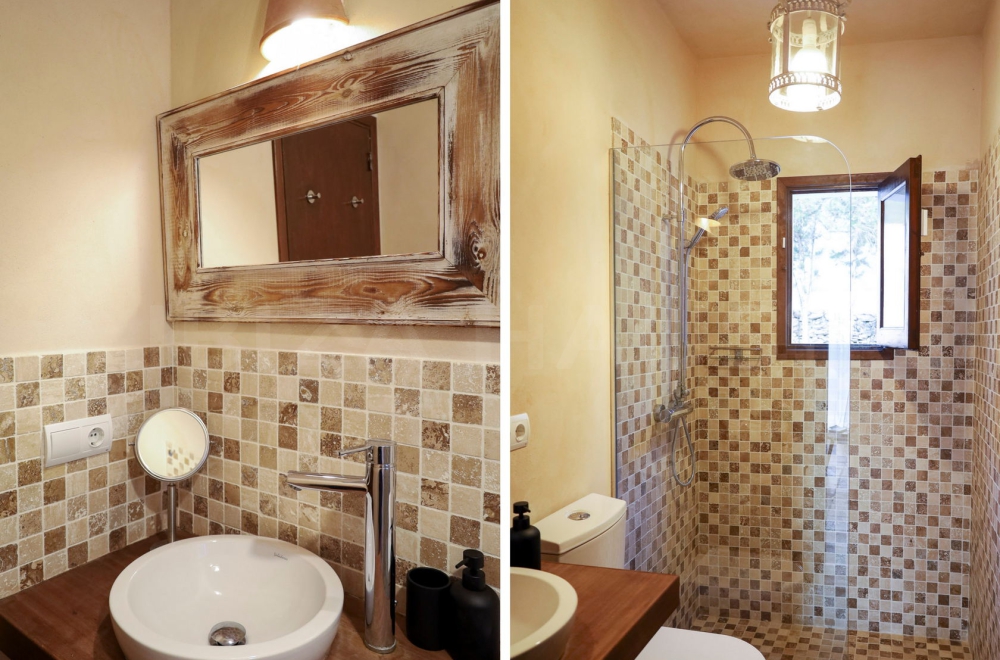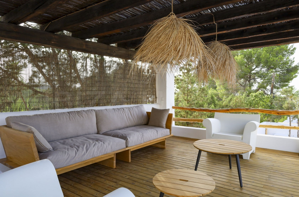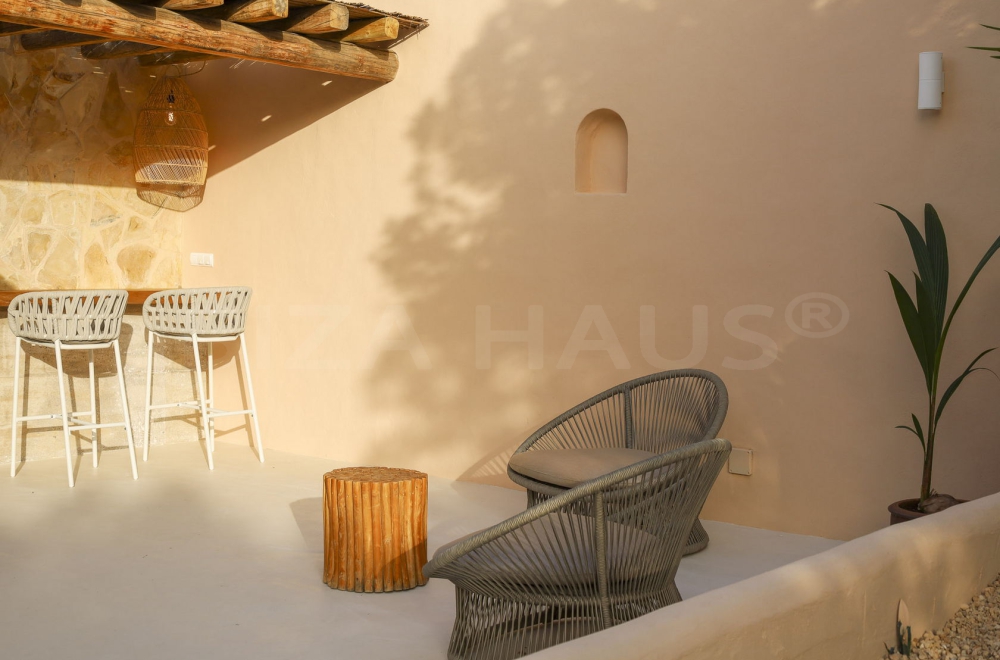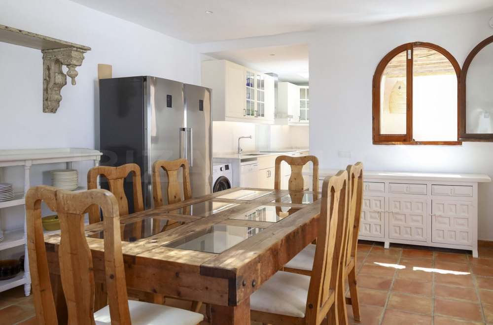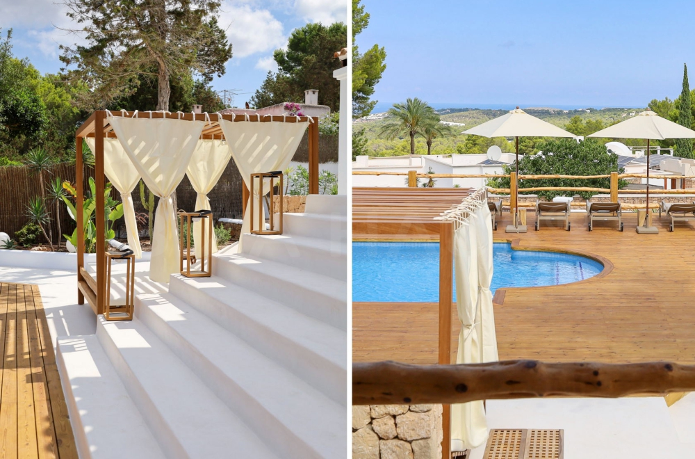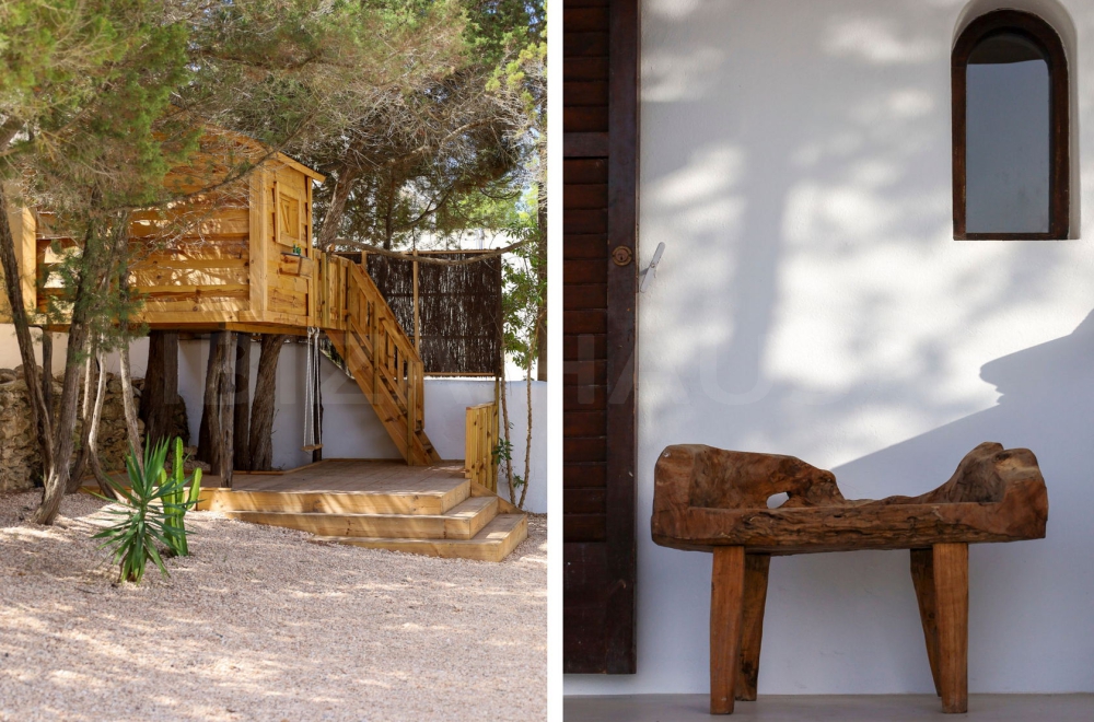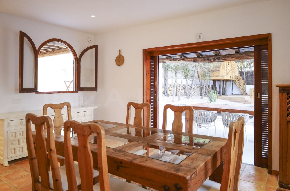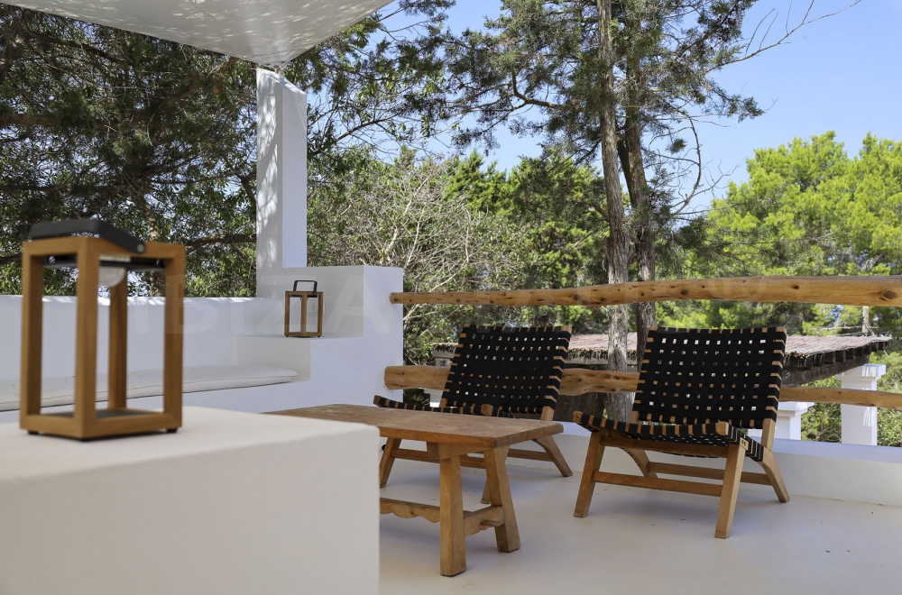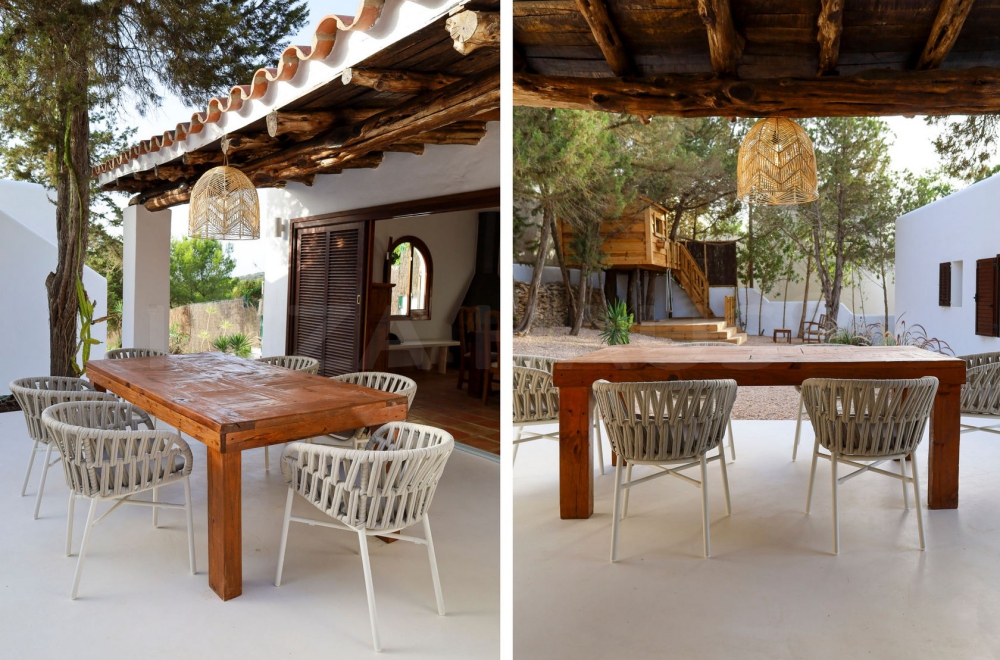 The highlight of the villa is its panoramic sea view, best enjoyed from the 9x5 m pool. The wooden terrace reveals a relaxing space with a covered veranda, sun loungers, and a Balinese-style bed. At the rear, a private courtyard surrounds the kitchen and dining room, complemented by a charming outdoor dining area under a veranda and a small wooden house nestled among the trees. Can Rafelet is more than just a holiday home; it is a true oasis of tranquility and comfort on the beautiful island of Ibiza.