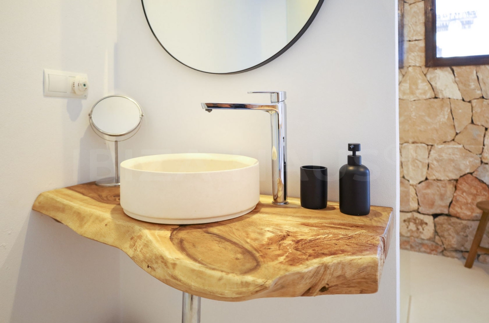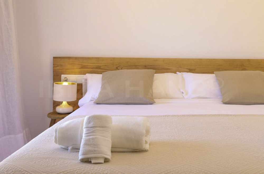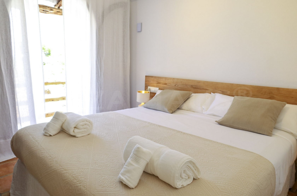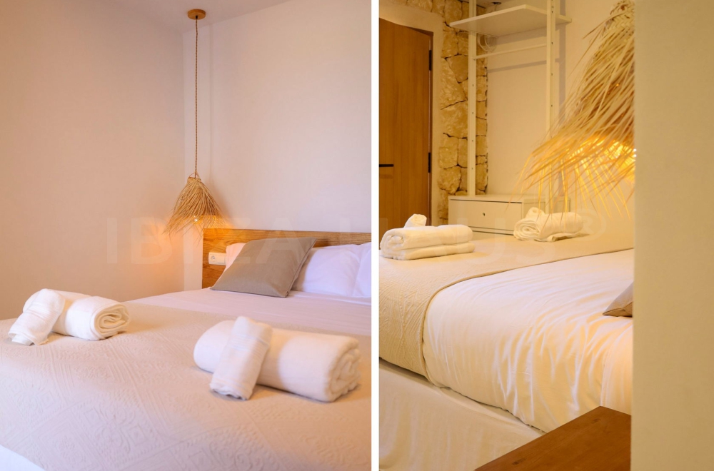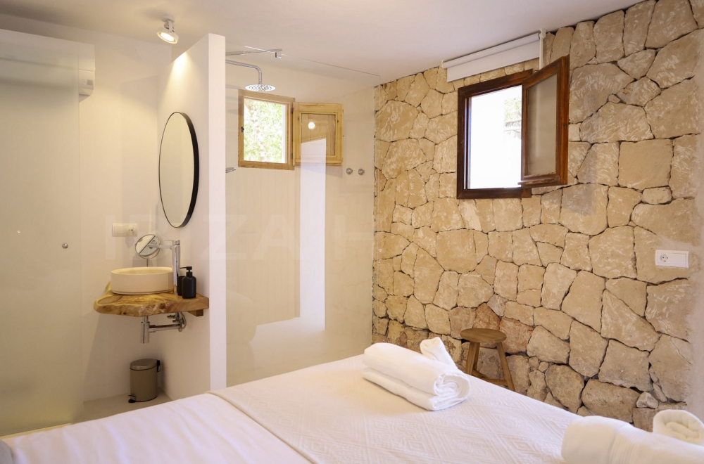 The property consists of the main house with three bedrooms (each with a king-size bed), one bathroom, and a cozy living area. In total, the villa offers four bedrooms and two bathrooms. For legal reasons, it is officially offered for five guests with three bedrooms and two bathrooms. The fourth bedroom, with a king-size bed and private bathroom, is independently located with steps leading directly to the pool. Can Rafelet therefore comprises a main house and an additional building. Three bedrooms plus a staff bedroom provide accommodation for up to five guests and three household staff.