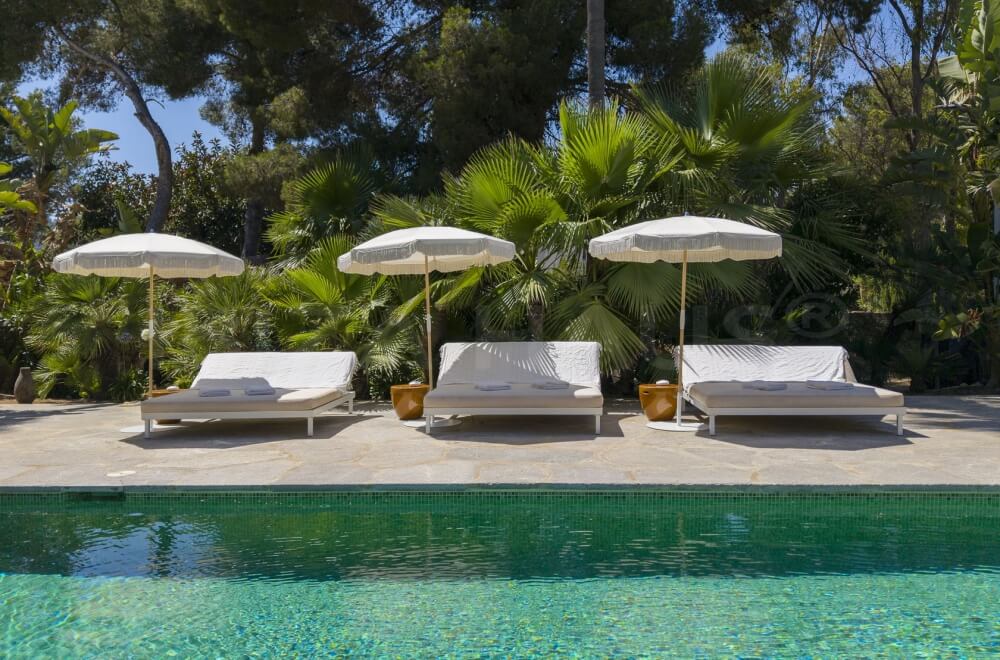 In the main building, there are 2 large bedrooms with adjacent bathrooms (one with a Jacuzzi) and walk-in closets. A separate staircase outside leads to 2 other bedrooms with en-suite bathrooms, one of which has its own terrace overlooking the pool. In the garden, there is an apartment with a fifth bedroom, its own bathroom, and a small private garden with a lounge chair.